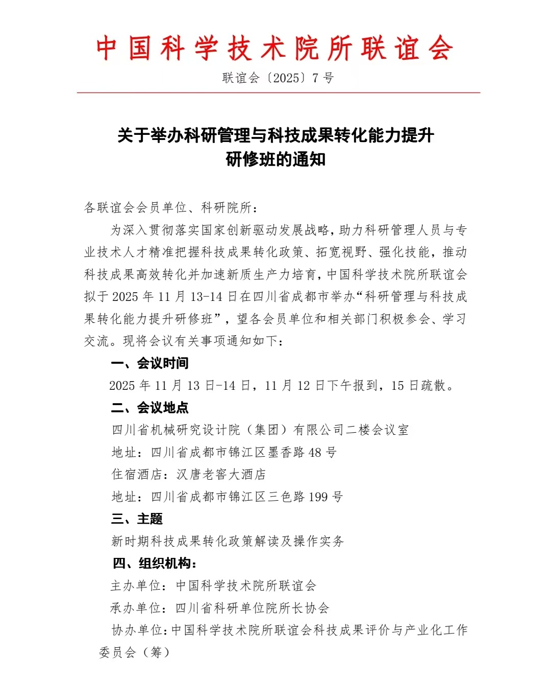 关于举办科研管理与科技成果转化能力提升研修班的通知